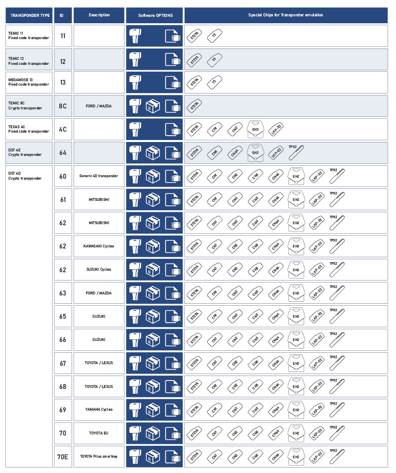 The TPX02 is a special cloning chip used to clone 4D/4E Texas Crypto transponder keys.