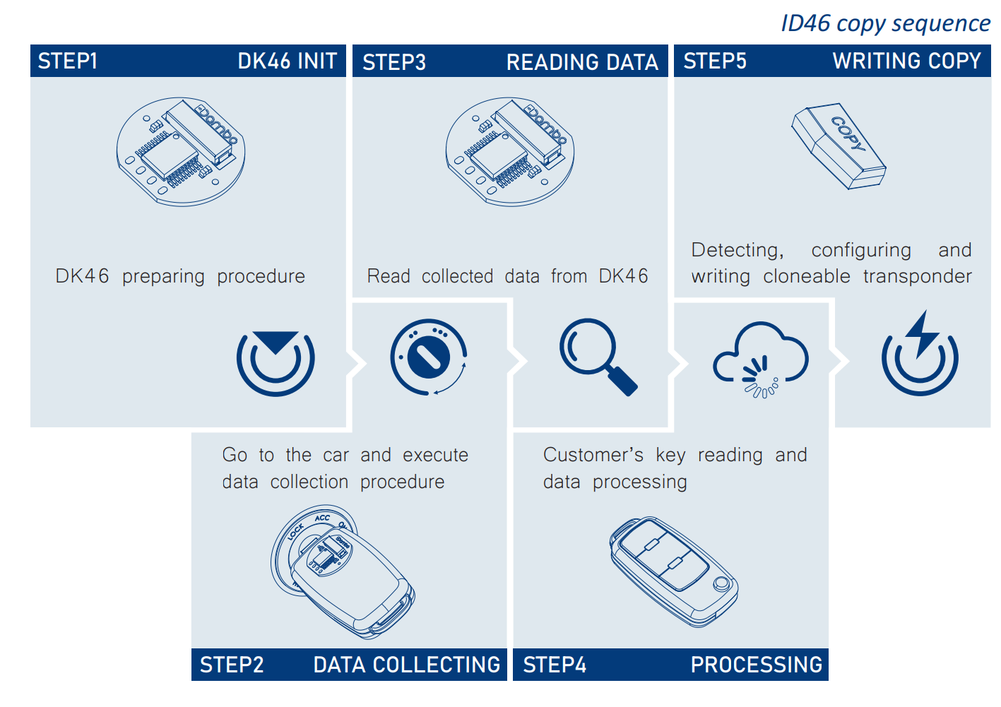 For copying ID46, it is required to perform the vehicle key data collection at the moment the ignition is turned on. For this operation, you must use the original key and a special device - DK46