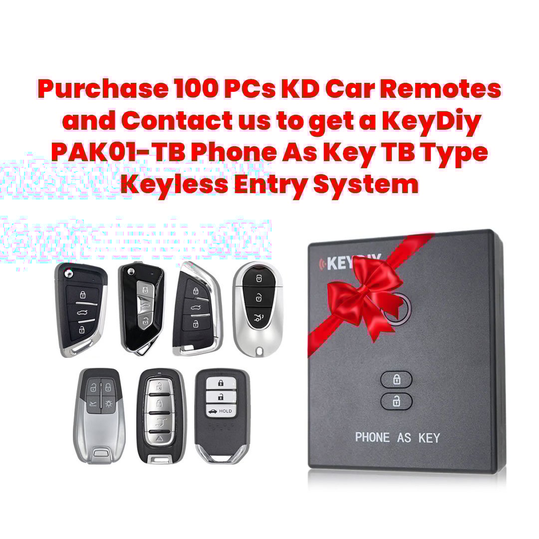 Purchase 100 PCs KD Car Remotes and Contact us to get a KeyDiy PAK01-TB Phone As Key TB Type Keyless Entry System