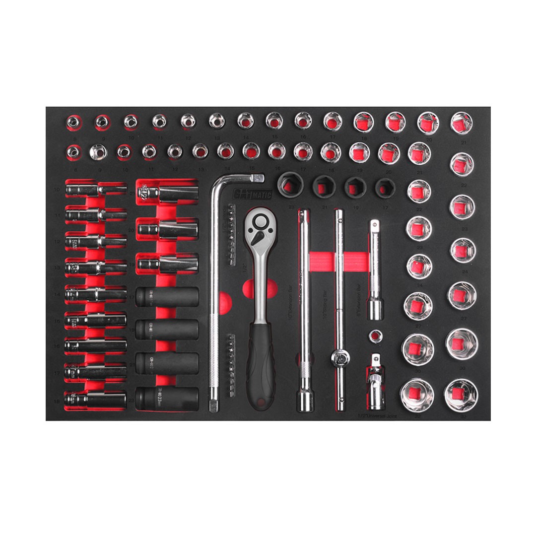 GATmatic GTT381 è un mobile portautensili con 381 pezzi di utensili completi, posizionati separatamente su 6 cassetti con guide a sfera a estensione completa. Il mobile mobile è dotato di un sistema di interblocco, ruote girevoli per impieghi gravosi e una maniglia ergonomica. Il piano di lavoro è configurato con un vassoio in ABS su cui puoi appoggiare qualsiasi altra cosa tu voglia.