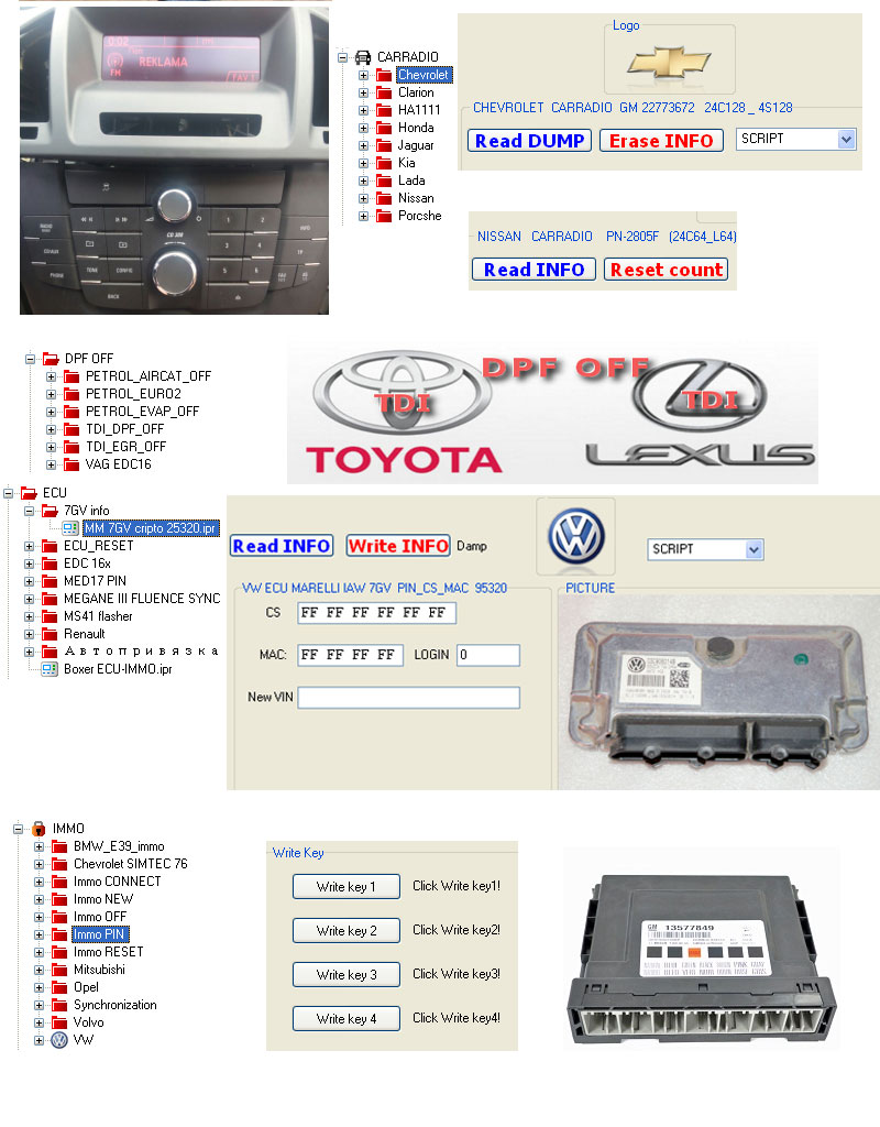 1. Functional: airbag, dashboard, car radio, ecu, eeprom, immo, mcu and special functions