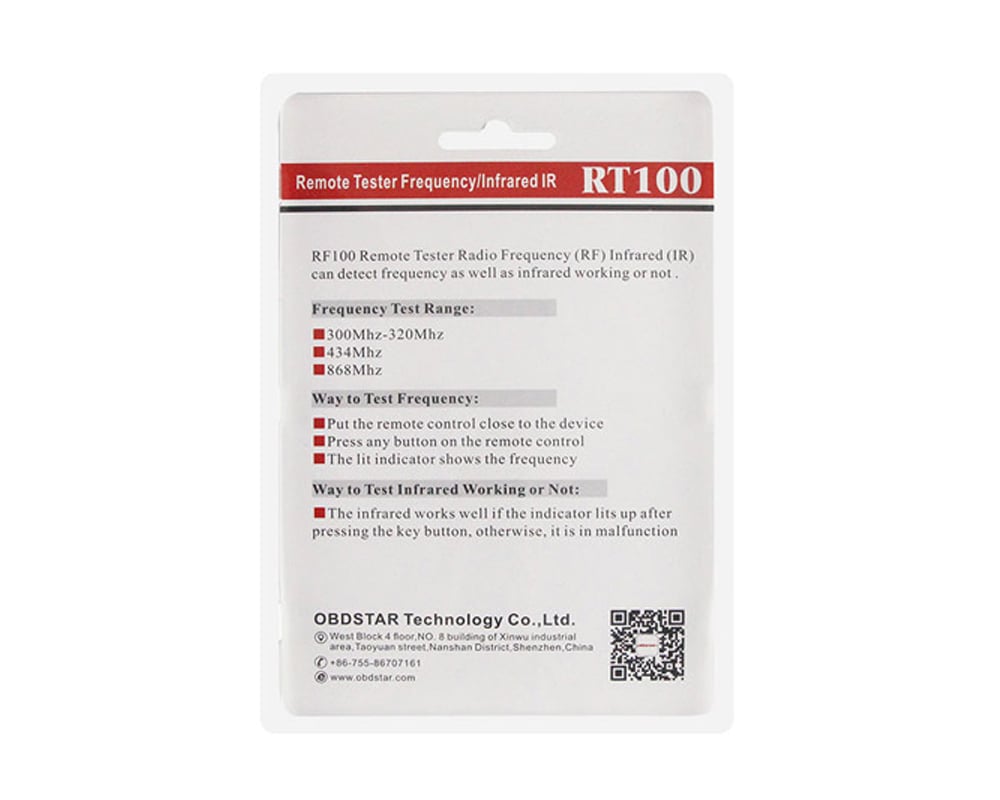 OBDSTAR RT 100 Remote Tester Frequency Infrared (IR) peut détecter la fréquence de la télécommande de la voiture ainsi que l'infrarouge fonctionne ou non, ce qui aide beaucoup dans la programmation des clés et l'entretien de la voiture.
